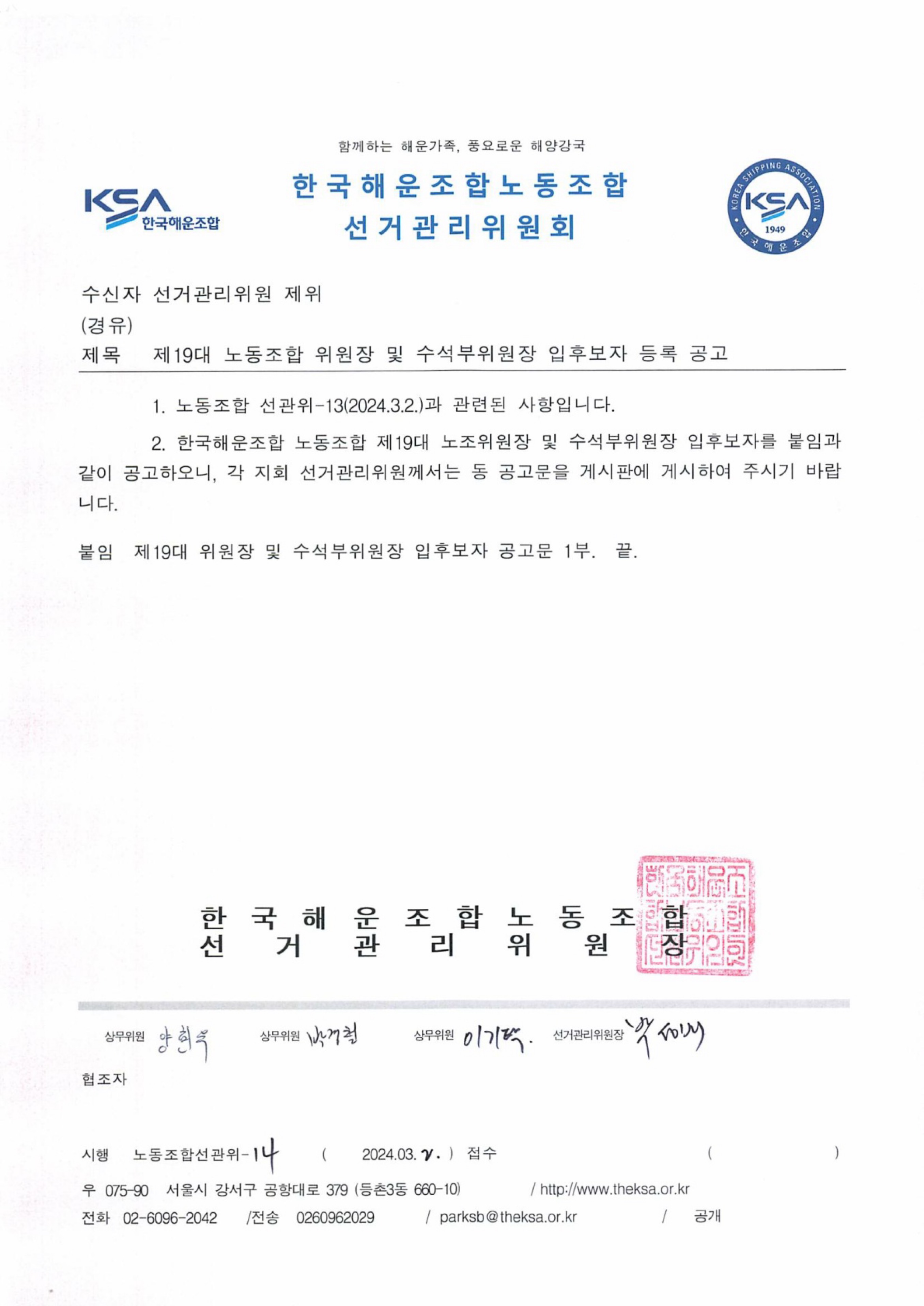 | 제목 | 제19대 노동조합 위원장 및 수석부위원장 선거 입후보자 등록 공고 | ||||