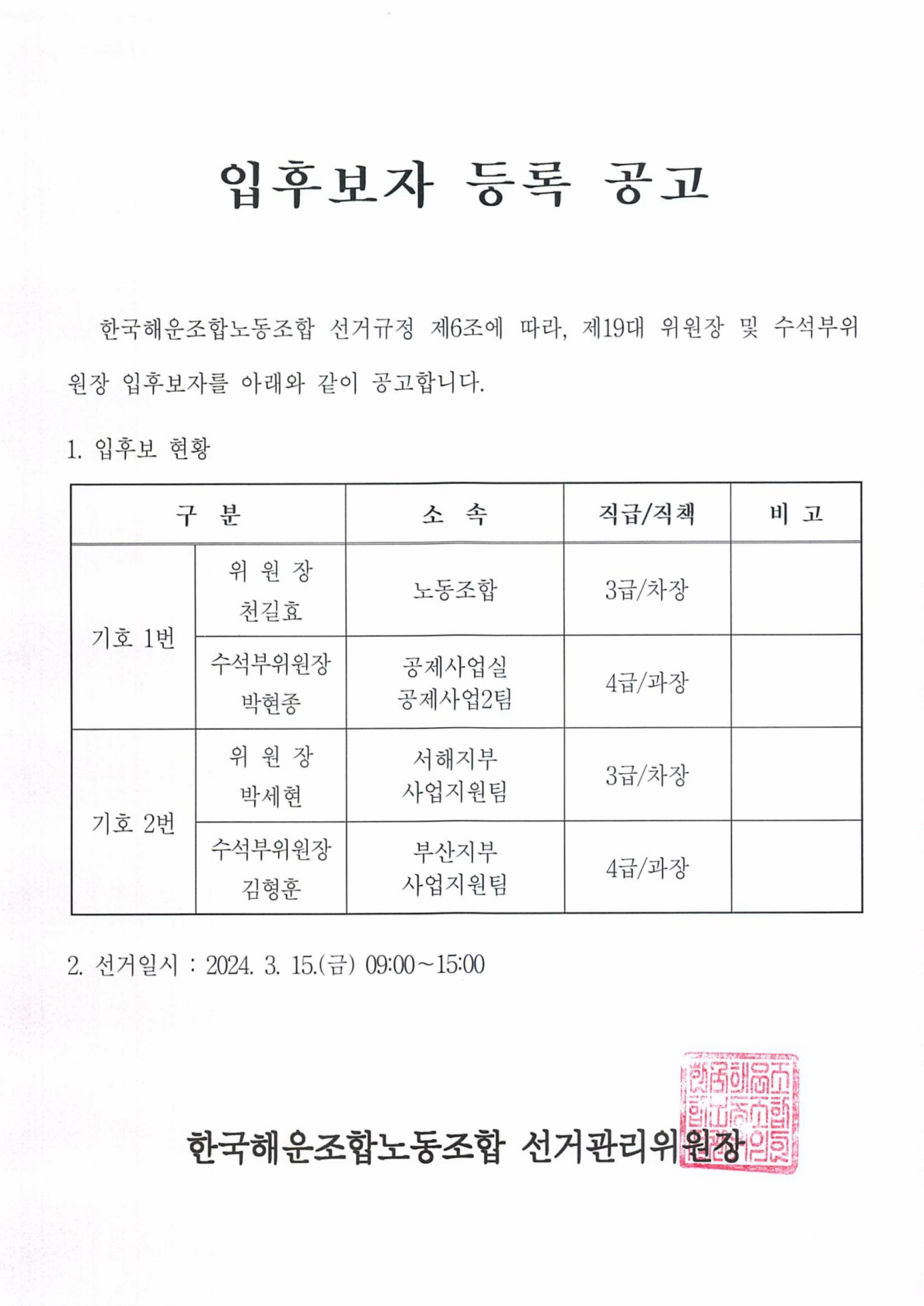 | 내용 | <제19대 노동조합 위원방 및 수석부위원장 입후보자 등록 공고>