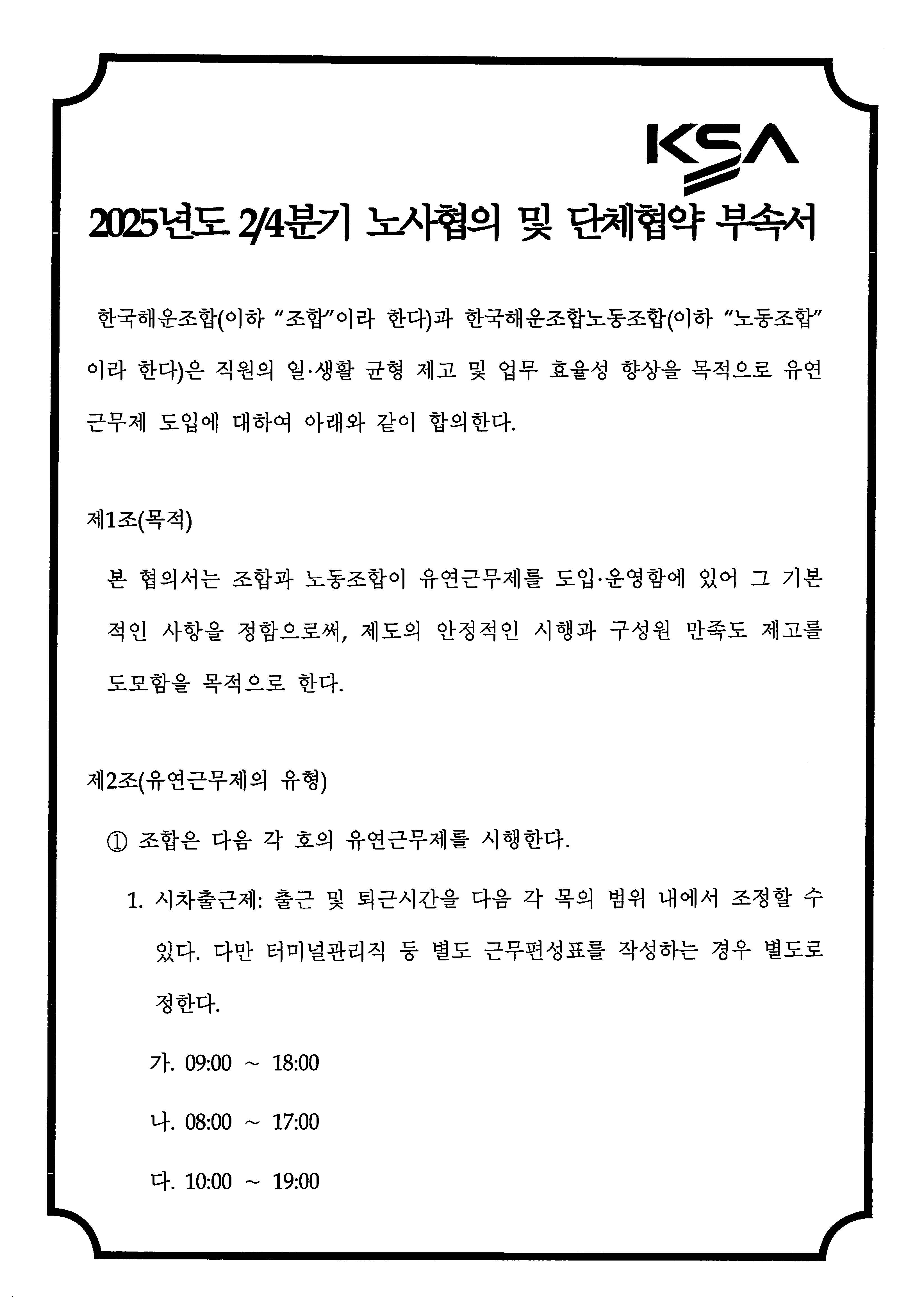 2025. 7. 10.(목) 2025년도 2분기 노사협의회를 개최하였습니다. 동 협의회에서는 유연근무제 도입, 육아 휴직자에 대한 업무대행 수당신설,