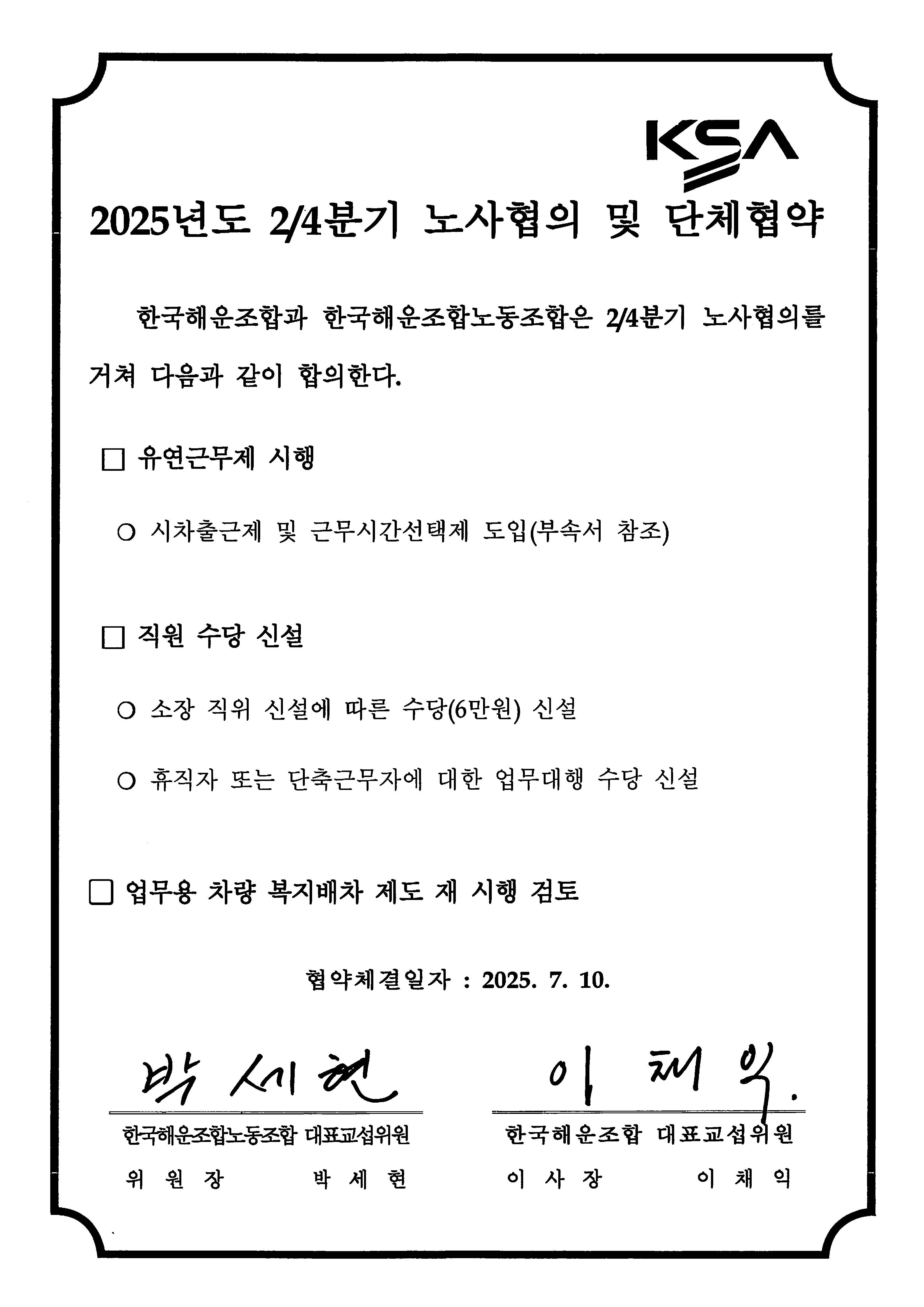 터미널소장 수당 신설, 임직원 복지차량 이용에 대하여 합의하였습니다.