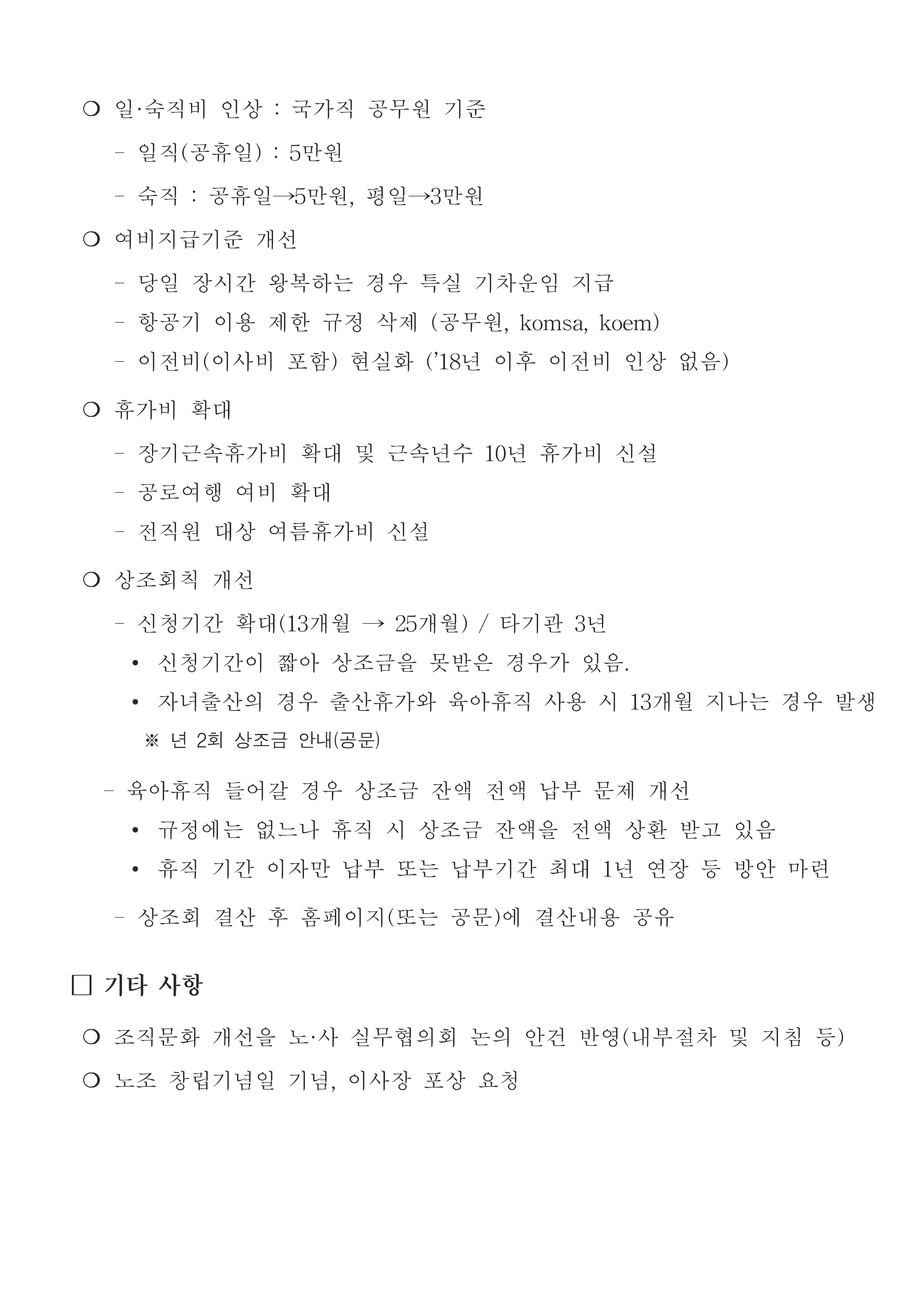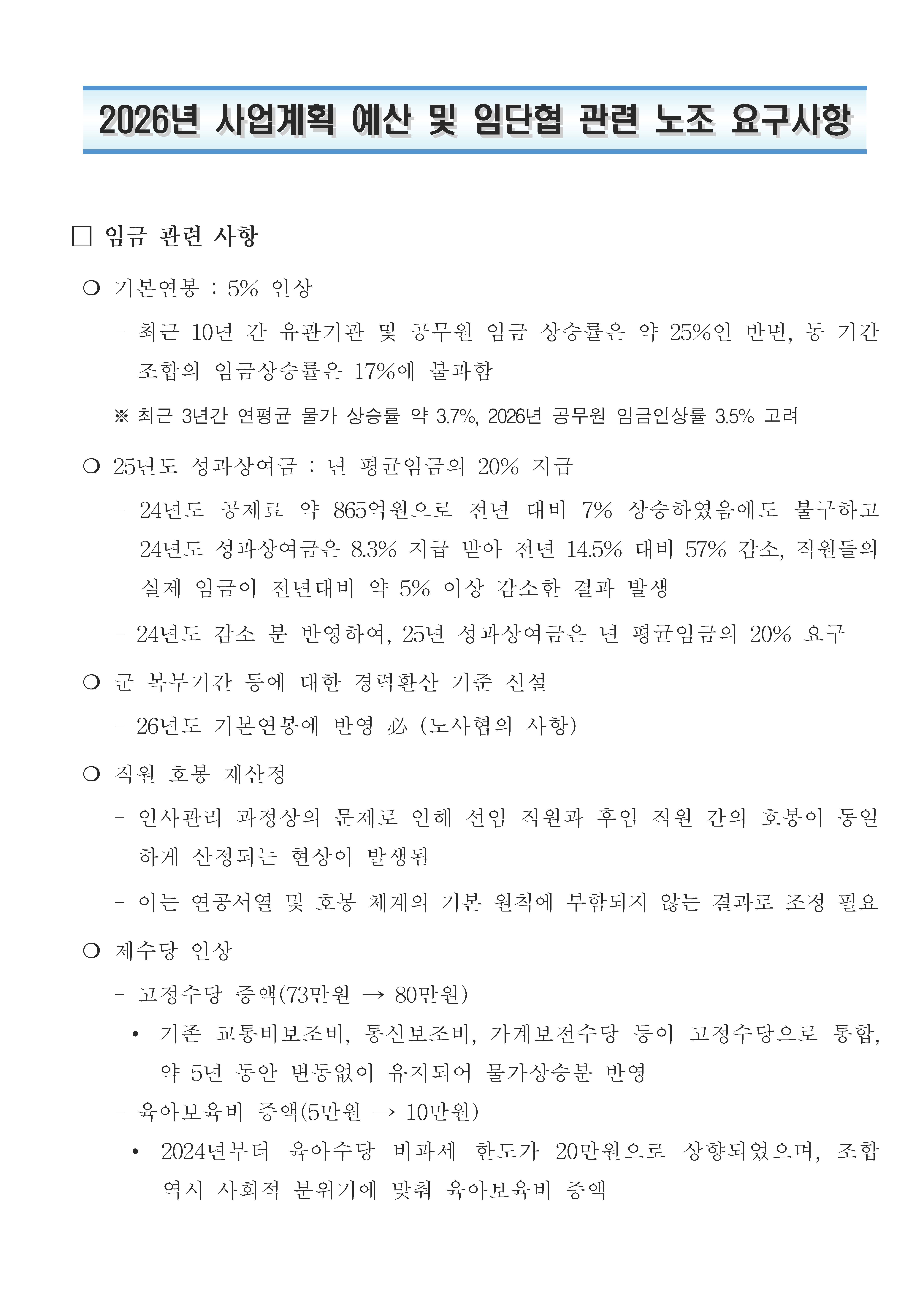 | 내용 | 2026년 사업계획 예산 및 임단협 관련 노조 요구사항입니다. 이견 있으신분들은 연락주시기 바랍니다.