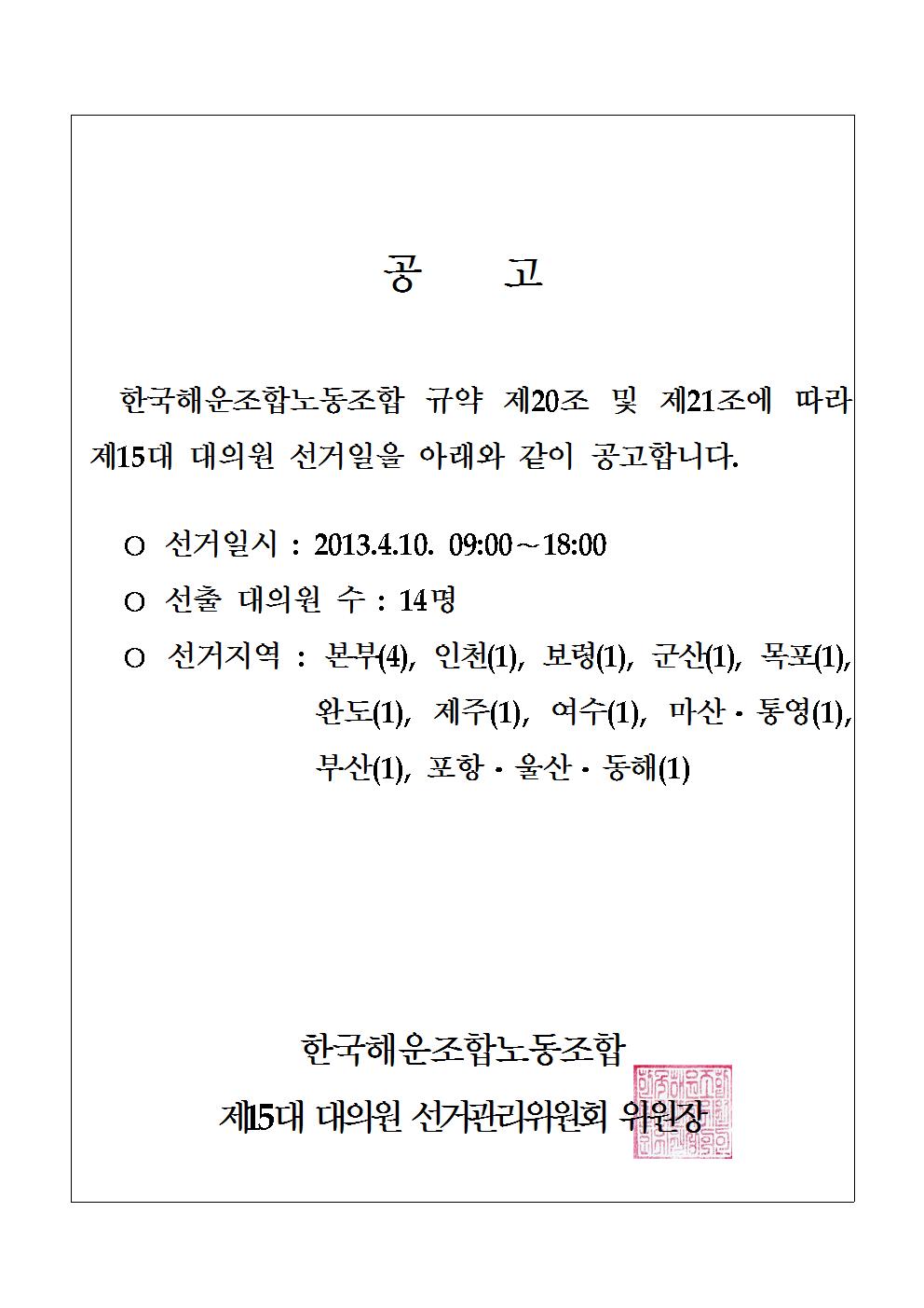 제15대 한국해운조합노동조합 대의원 선거일 공고
