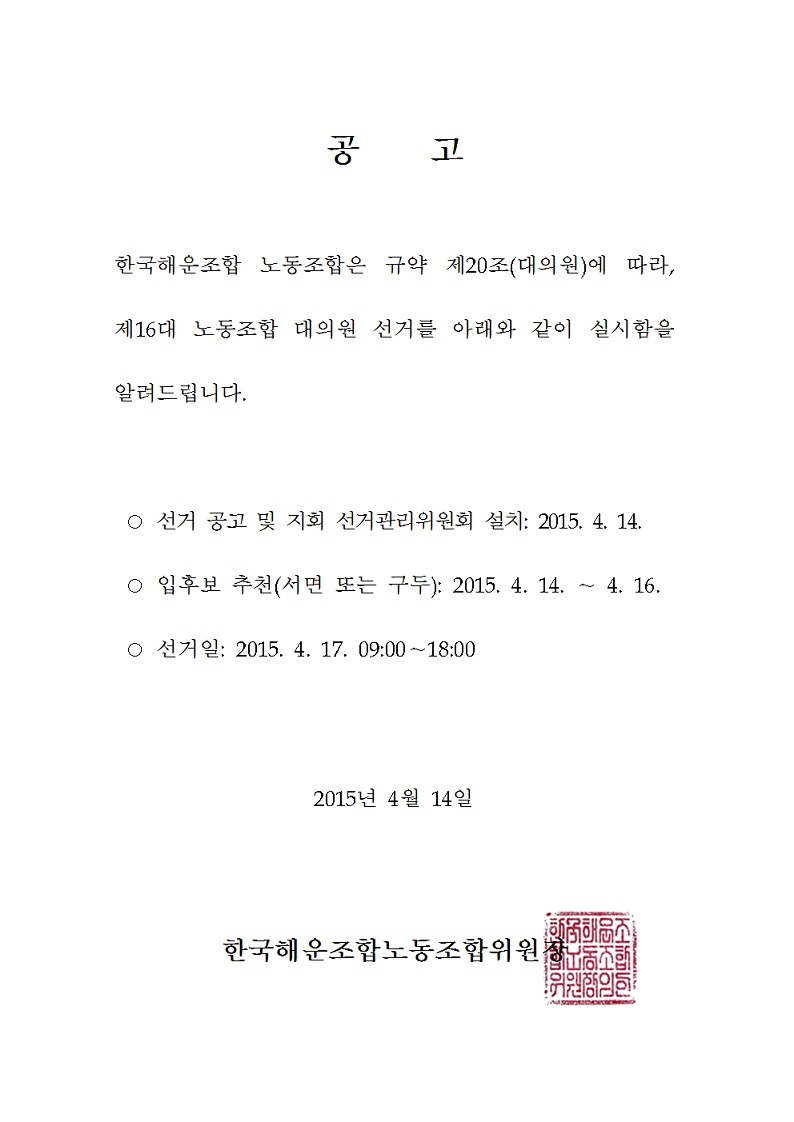 | 내용 | 한국해운조합 노동조합 제15대 집행부 및 대의원의 임기 종료(’15.4.30.) 예정에 따라 노동조합 규약 제20조 및 선거규정 제3조에 따라 제16대 대의원 선거를 아래와 같이 실시함을 알려드립니다. 1. 선거지역 : 전 지회 2. 선출인원 : 17명(본부4, 인천1, 보령1, 군산1, 목포1, 완도1, 제주1, 여수1, 통영1, 마산1, 부산1, 울산1, 포항1, 동해1) 3. 대의원 선거 일정 가. 지회 선관위 설치 및 공고(2015. 4. 14.) 나. 입후보 등록 및 추천 : 서면 또는 구두(2015. 4. 14.~ 4. 16.) 다. 선거일 : 2015. 4. 17.(금) 09:00~18:00