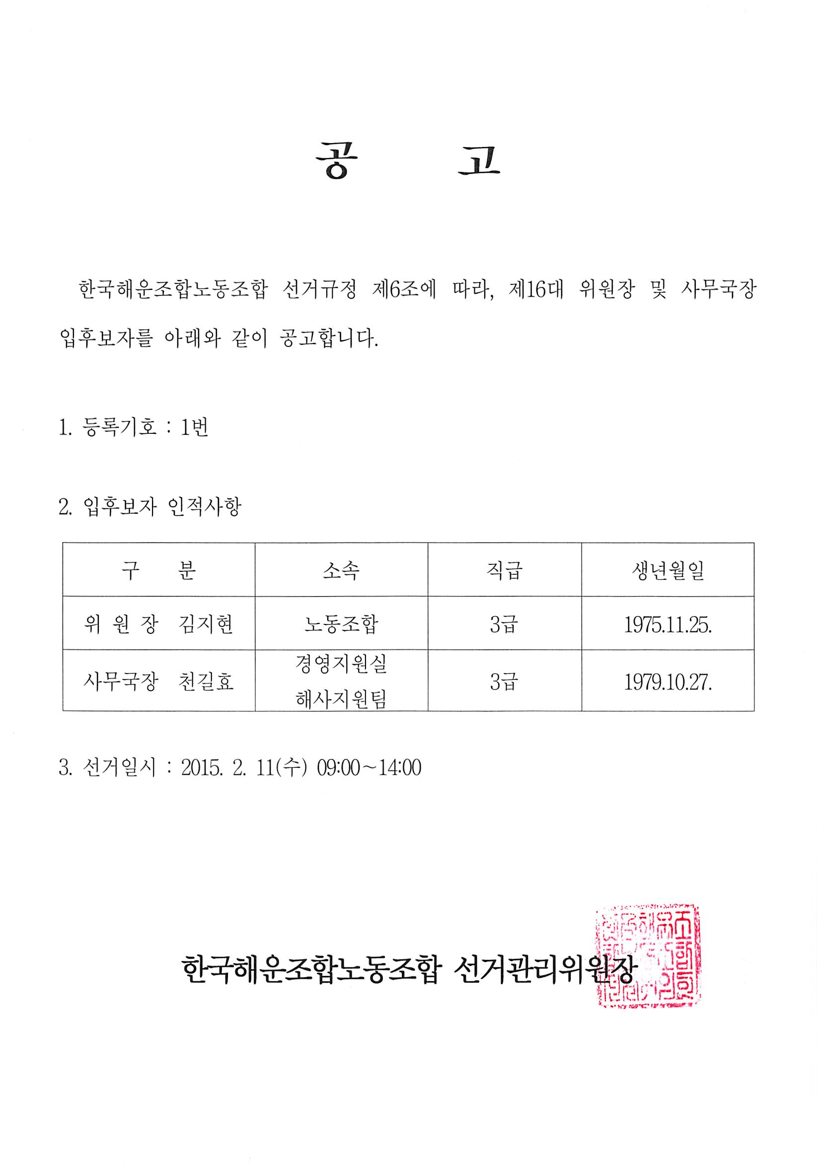 한국해운조합 노동조합 제16대 노조위원장 및 사무국장 입후보자를 아래와 같이 공고합니다.