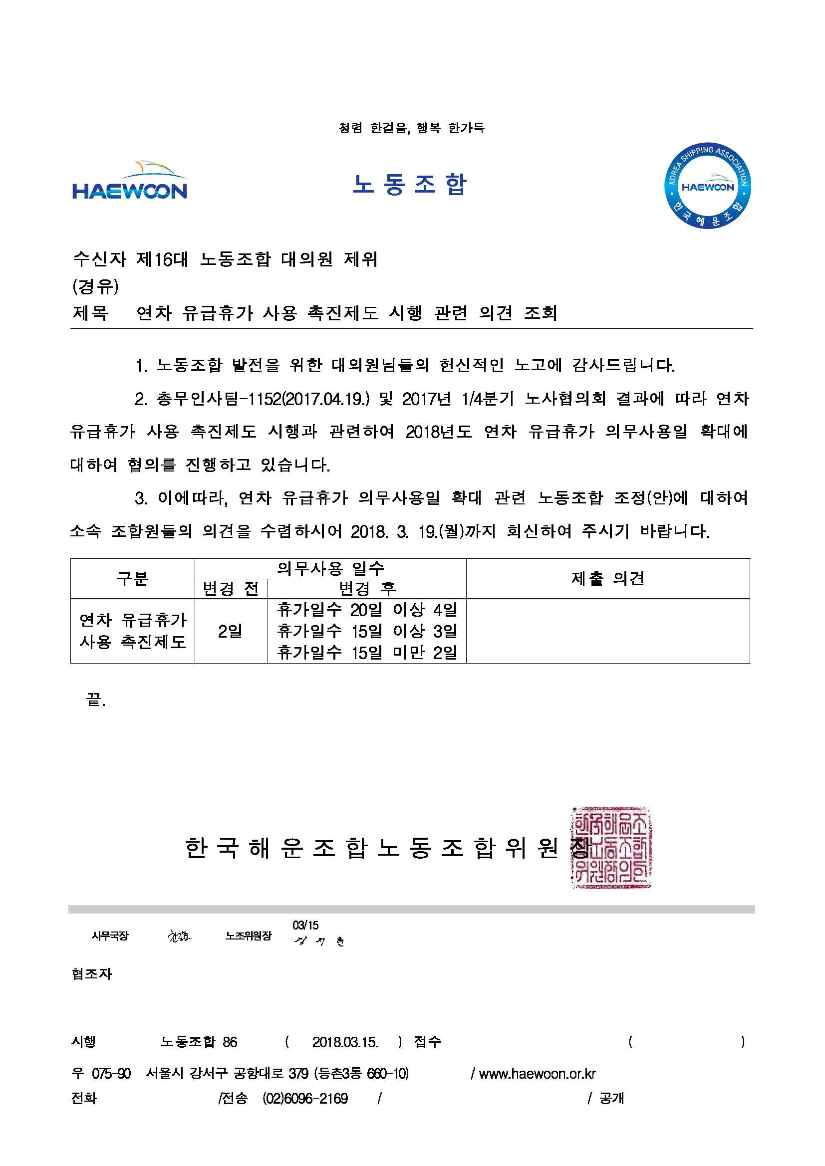 내용 | 연차 유급휴가 사용 촉진제도 시행 관련하여 조합원들의 의견을 조회 하오니 각 지회 대의원을 통해 의견을 제출하여 주시기 바라며, 찬반 여부가 아닌 확대에 따른 개선 및 보완되어야 할 사항에 대하여 많은 의견 주시기 바랍니다. ![]() |
