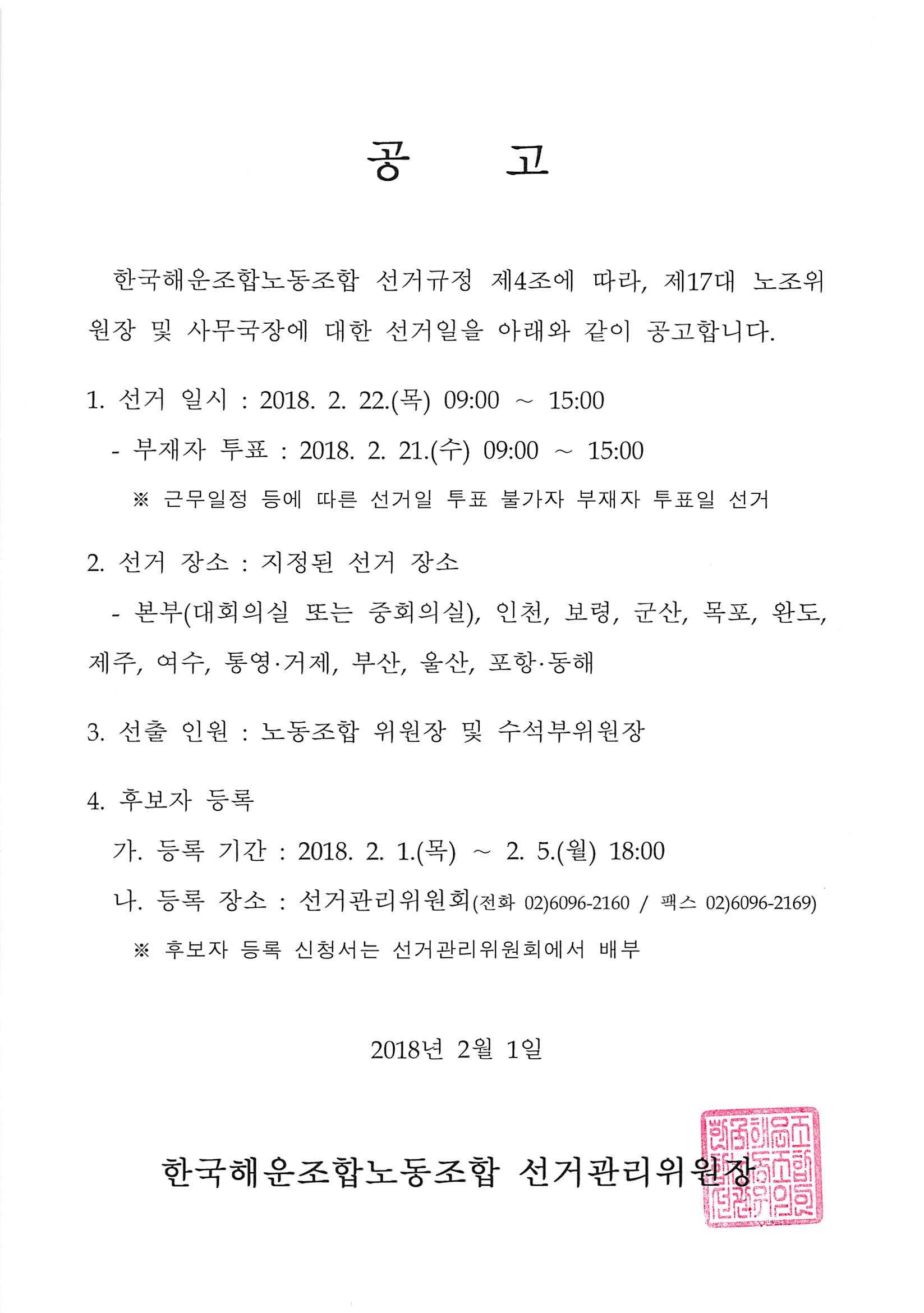 제17대 노동조합 위원장 및 수석부위원장 선거일 공고