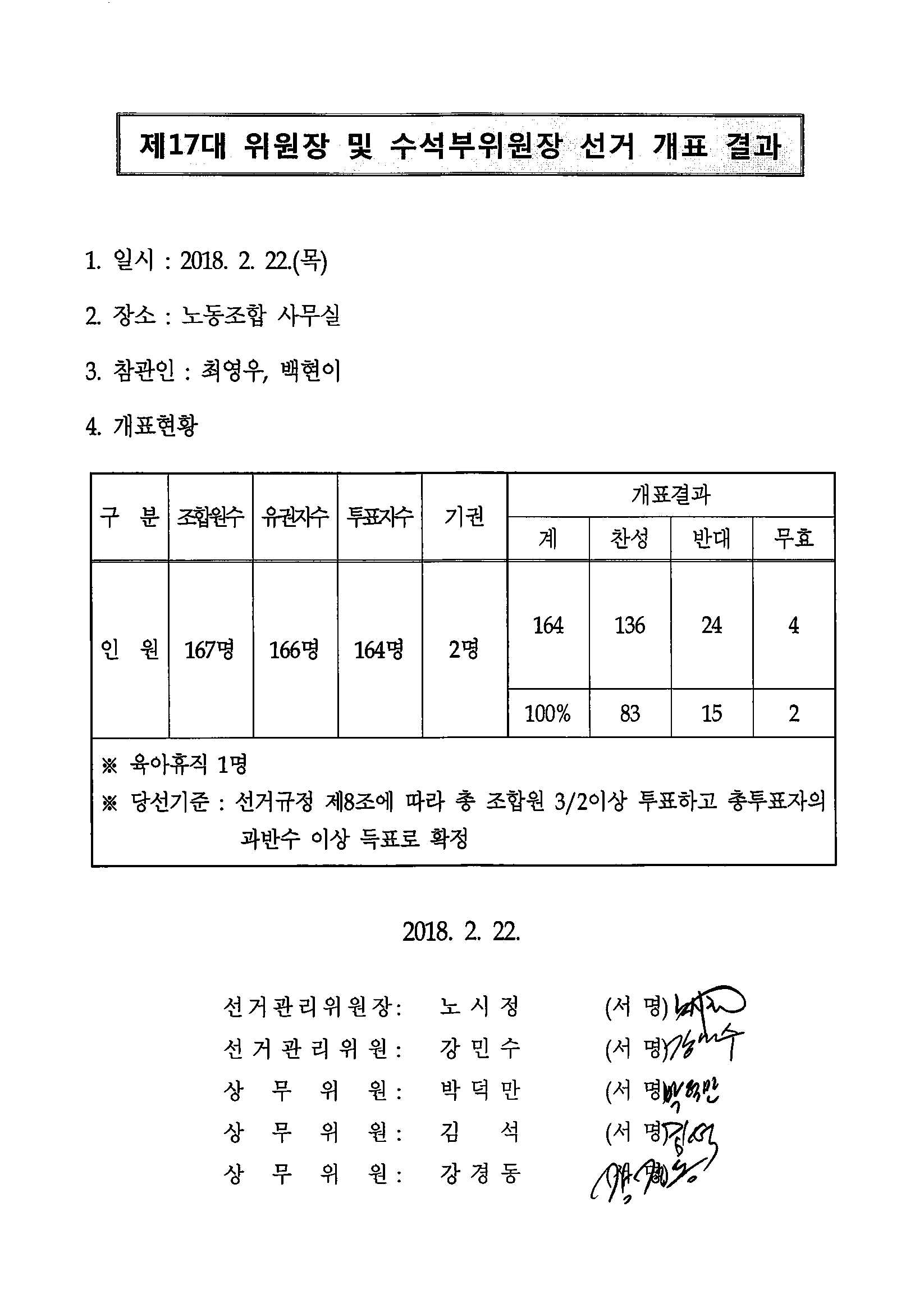 2018년 2월 22일 실시한 제17대 노동조합 위원장 및 수석부위원장 선거 개표 결과를 아래와 같이 알려드리오니 참고하시기 바랍니다.