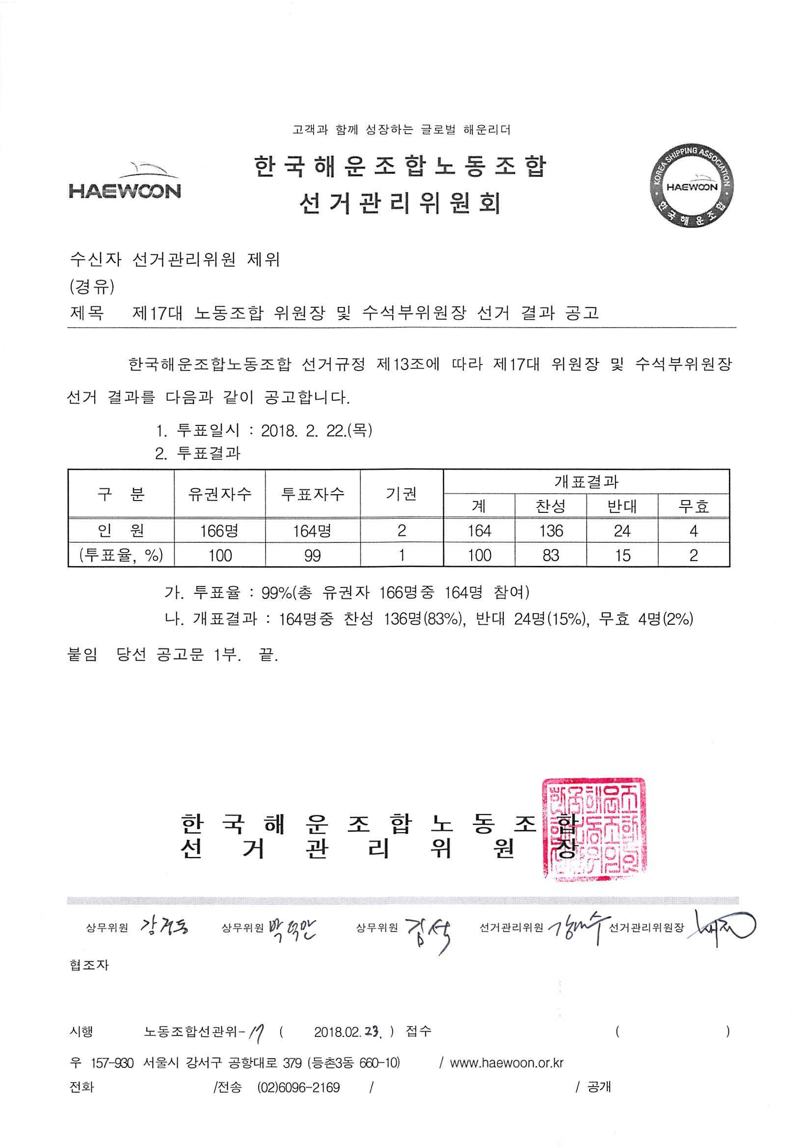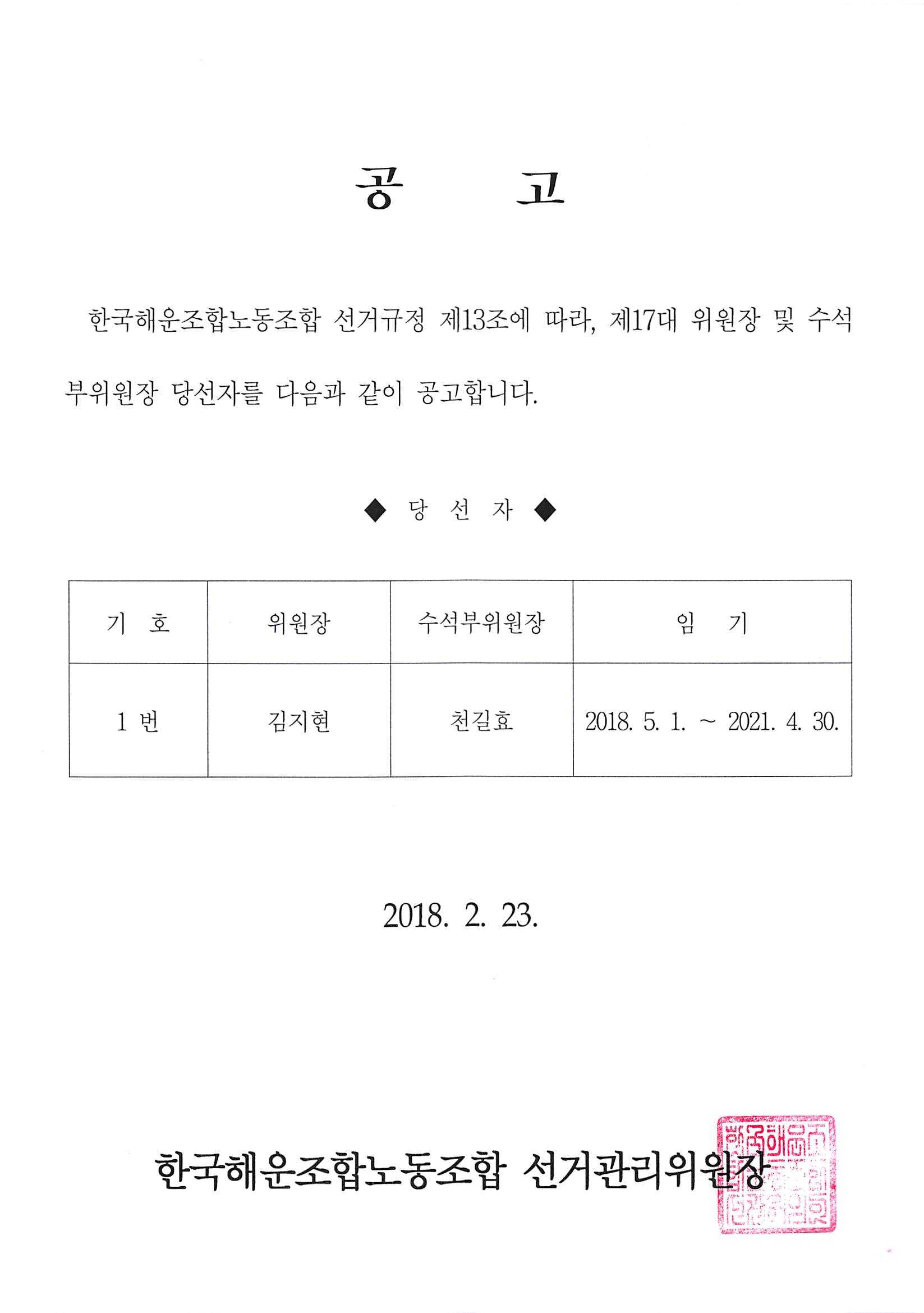 한국해운조합 노동조합 선거규정 제13조에 따라 제17대 위원장 및 수석부위원장 선거 결과를 다음과 같이 공고합니다.