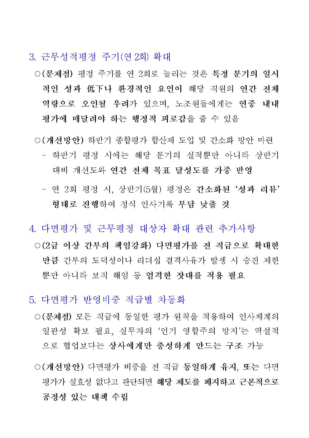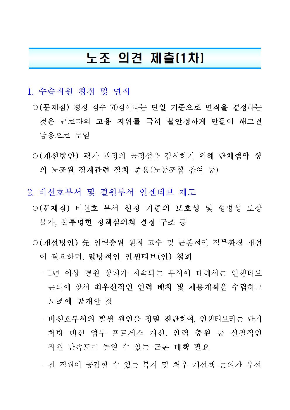 안녕하십니까 노조위원장입니다. 즐거운 명절 연휴를 앞두고 인사제도 개편 관련 진행상황을 보고 드립니다. 지난해부터 노동조합은 이사장과의 면담 등을 통해 "공정한 평가체계 수립"을 최우선 핵심과제로 지속적으로 제기해 왔습니다. 이번 인사제도 개편안은 이런한 노조의 목소리에 대해 사측이 나름 개선의지와 진정성을 가지고 준비한 결과물이라고 판단됩니다. 다만, 조합원의 권익과 직결되는 만큼 노동조합은 제출된 안을 면밀히 검토하여 1차 의견서를 제출하였습니다. 이에 사측도 노조의 의견에 공감하고, 일정상 문제 등을 이유로 당초 계획 보다 대폭 간소화된 형태로 개정을 하였습니다. 이번에 반영되지 못한 세부 평가 기준과 공정성 확보 방안 등은 향후 지속적으로 보완해 나가기로 사측과 협의하였습니다. 단순한 제도 개편을 넘어, 인력충원과 근무환경 개선 등 우리가 직면한 근본적인 문제들이 해결될 수 있도록 끈질기게 협상하고, 노조원 여러분의 권익이 침해받지 않도록 최선을 다해 목소리를 내겠습니다. 노동조합을 믿고 지지해 주시는 조합원 여러분께 다시 한번 감사드리며, 곧 다가올 명절 연휴 가족분들과 함께 따뜻하고 행복하게 보내시길 바랍니다. 감사합니다. |