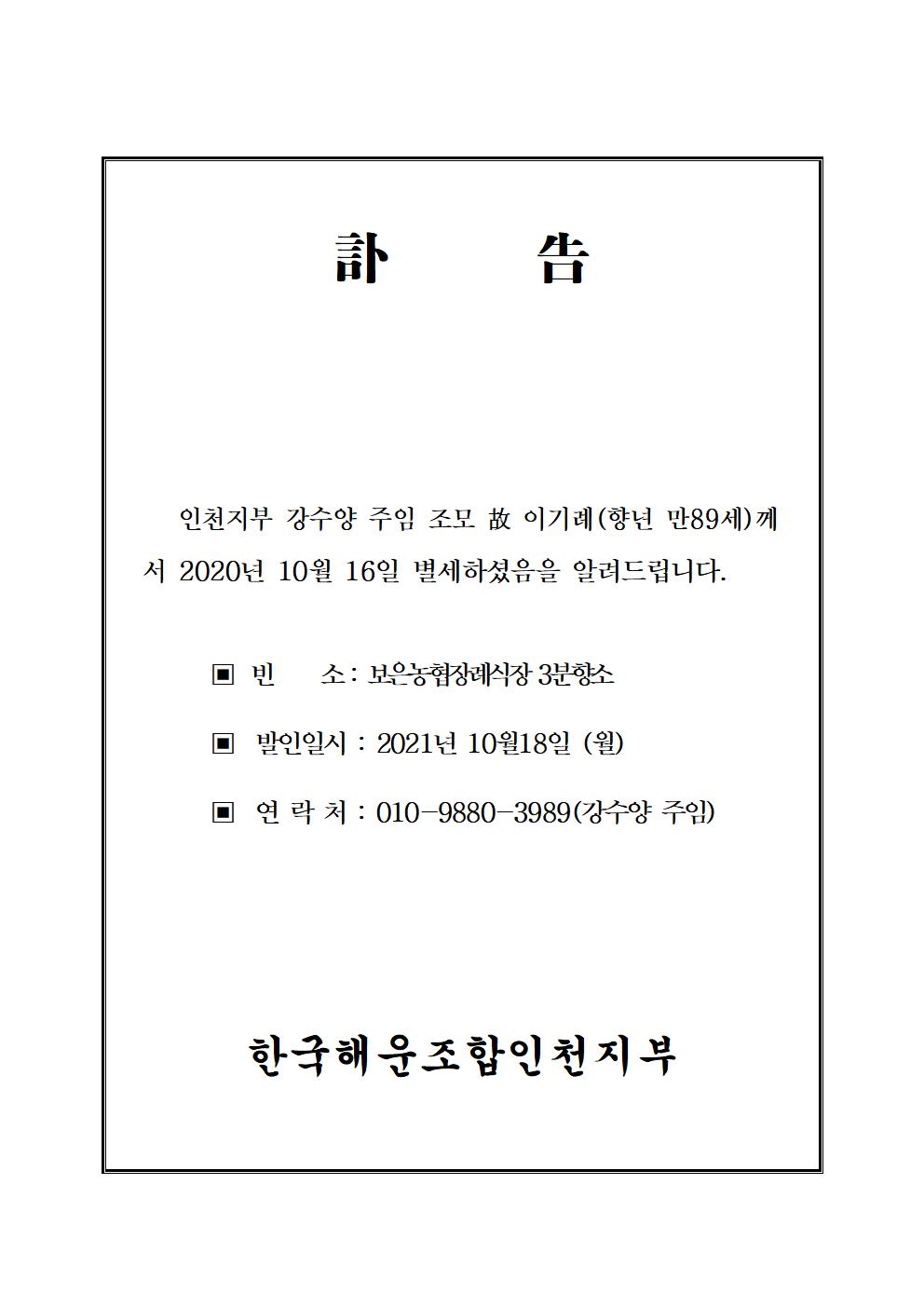 (訃 告) 인천 강수양 주임 조모상(21.10.16.)