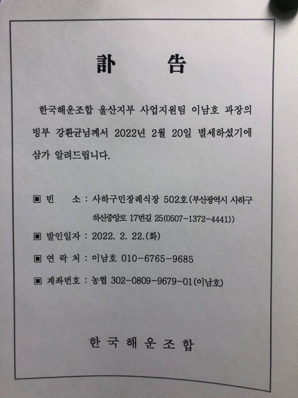 (訃 告) 울산 이남호 과장 빙부상(22.02.20.)