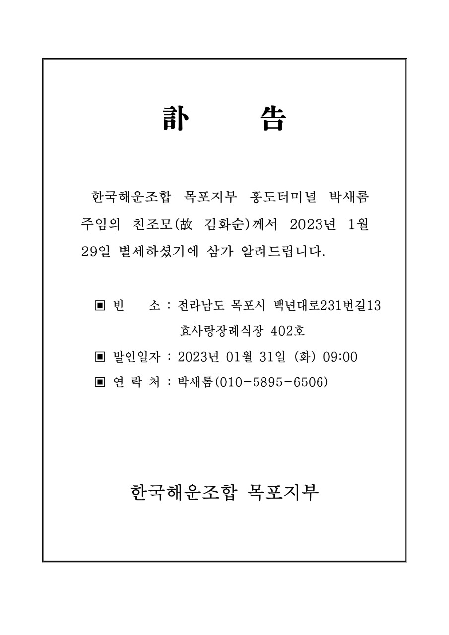 (訃 告) 목포지회 박새롬 조합원 조모상(23.1.29.)