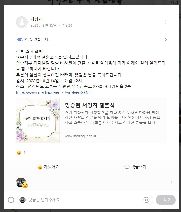 (祝 結婚) 여수지회 명승현 조합원 결혼(23.10.14.)
