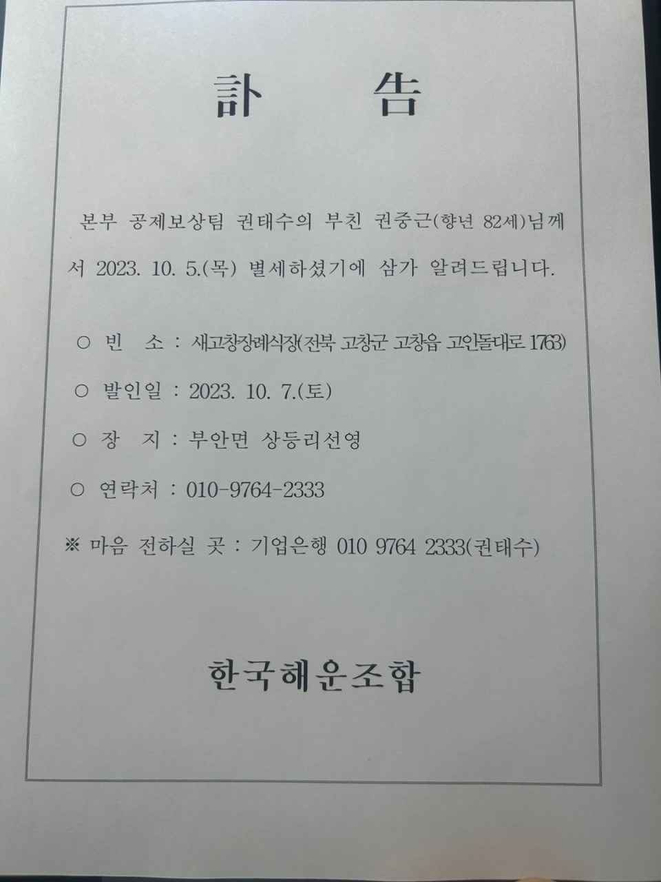 (訃 告) 본부지회 권태수 조합원 부친상(23.10.5.)