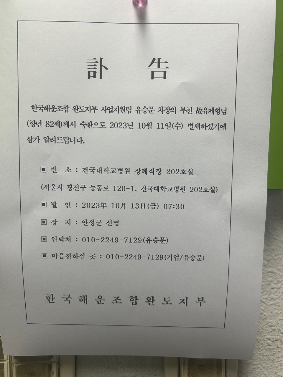 (訃 告) 완도지회 유승문 조합원 부친상(23.10.13.)
