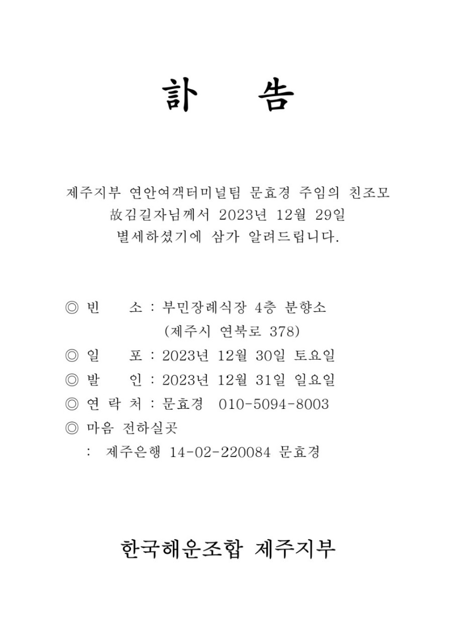 (訃 告) 제주지회 문효경 조합원 조모상(23.12.29.)
