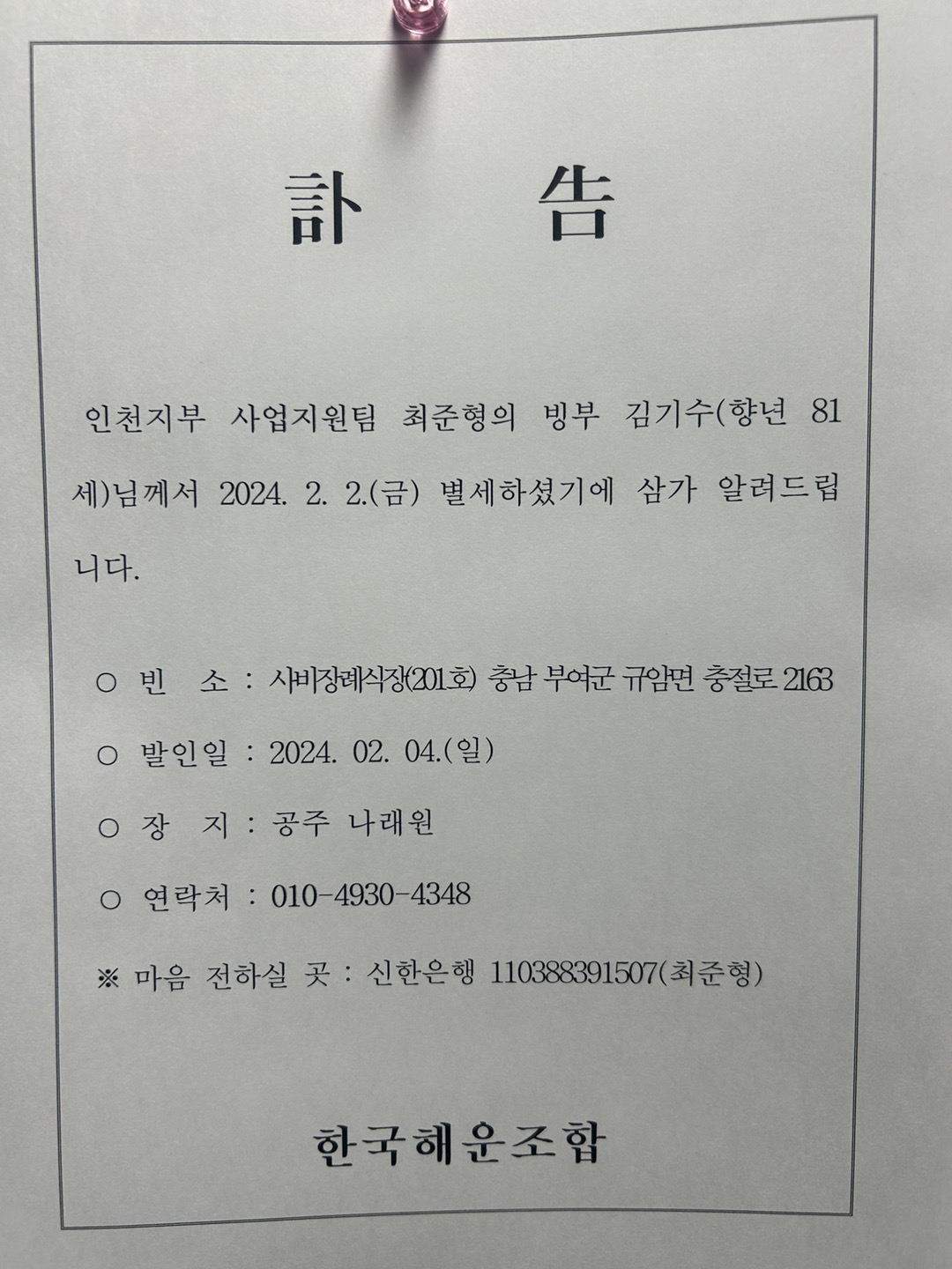 (訃 告) 인천지회 최준형 조합원 빙부상(24.02.02.)