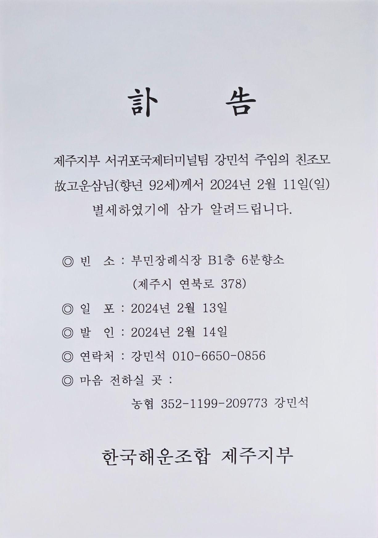 (訃 告) 제주지회 강민석 조합원 조모상(24.2.11.)