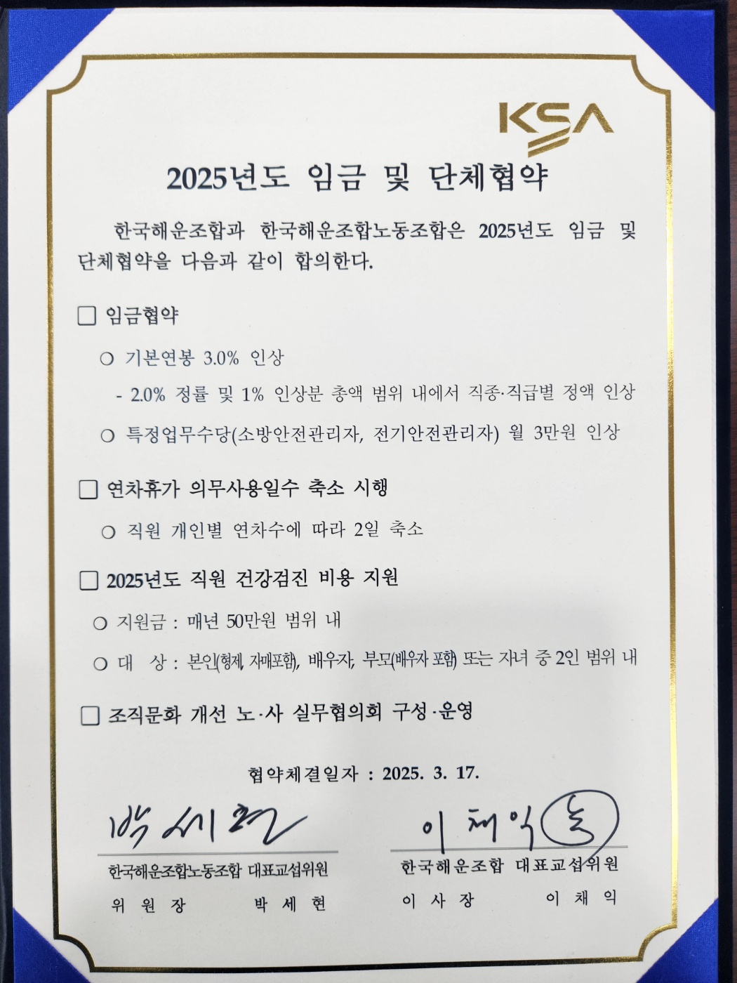 2025년도 임금·단체협약 및 2025년도 1/4분기 노사협의회 결과